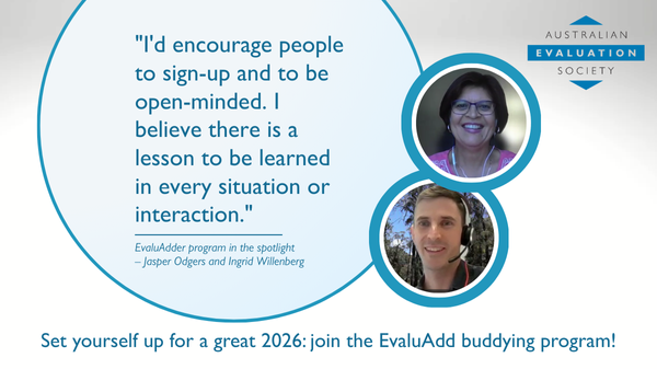| Set yourself up for a great 2026: join the EvaluAdd buddying program! The EvaluAdd program pairs buddies with ‘EvaluAdders’, with the goal of developing participants’ evaluation skills and capabilities. Evaluadders and buddies meet informally, according to their own schedule. Check out more about the program, timings and find the EOI forms here. You can also read about an EvaluAdder and buddy experience on the AES blog. | |