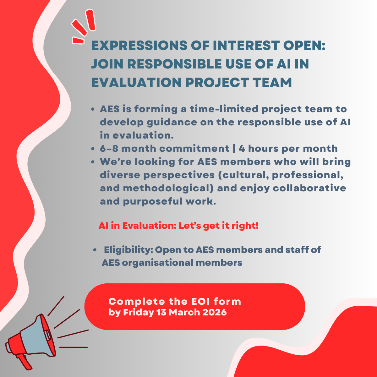 | AES is seeking expressions of interest (EOI) from members (including staff of organisational members) to join a 6–8 month project team - Responsible Use of Artificial Intelligence in Evaluation. The team will develop an AES policy position to guide the ethical, culturally responsive and effective use of AI in evaluation - strengthening trust, rigour and professional standards. Read the terms of reference Submit your EOI: https://www.surveymonkey.com/r/GJ7CCZN EOI close 13 March 2026 |
